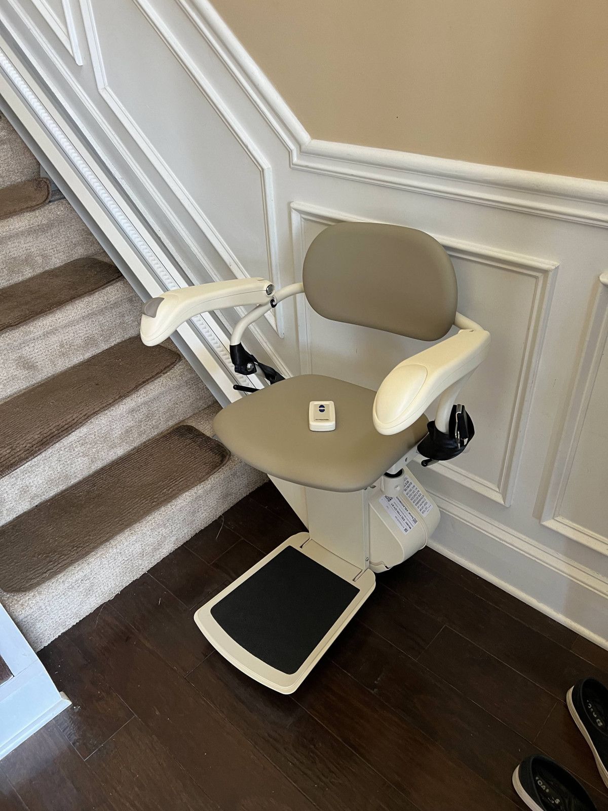 This project is a great example of a standard straight stair lift installation. The staircase required a stock length of 186" of rail with a standard park at both the top and the bottom of the stairs. Stair lift track affixes to brackets on the stair tread, not to the wall, so that beautiful wainscoting wasn't damaged. Our customer was the perfect candidate for the Harmar SL 300 model. It has a weight capacity of 300 lbs., a 19" x 16" seat depth, and a swiveling seat. They are thrilled to now be able to access 2nd floor beds, and baths!